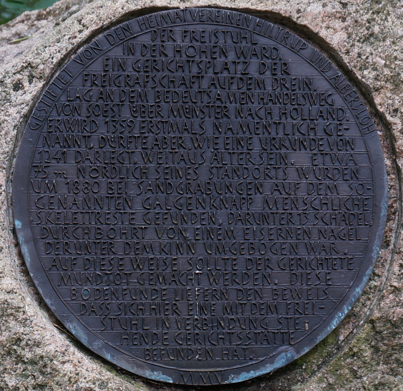 Aber die Stadt Münster denkt auch an die Wanderer und Spaziergänger im Wald und warnt davor, dass der Eichenprozessionsspinner Allergien und Gesundheitsstörungen verursachen kann. Eine gruselige Geschichte erzählt auch die bronzene Tafel auf dem Freistuhl, einem Gerichtsplatz, in dessen Nähe 13 Schädel Gerichteter gefunden wurden, die durch einen von oben nach unten durch den Schädel getriebenen Nagel, der unterhalb des Kinns umgebogen war, im wahrsten Sinn des Wortes "mundtot" gemacht wurden - irgendwann gegen Ende des Mittelalters.