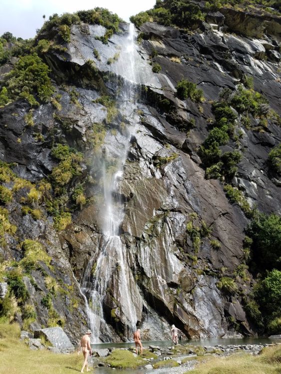 Am achten Tag schlossen wir uns zahlreichen bekleideten Menschen an, um die tausend Fuß hohen Wasserfälle zu bewundern, die vom Rob Roy-Gletscher strömen. Aber auf dem Rückweg hielten wir ein paar Kilometer entfernt an einem Wasserfall an, der in ein Becken auf der Rückseite einer Schafweide stürzt, und genossen ein weiteres nacktes Bad.