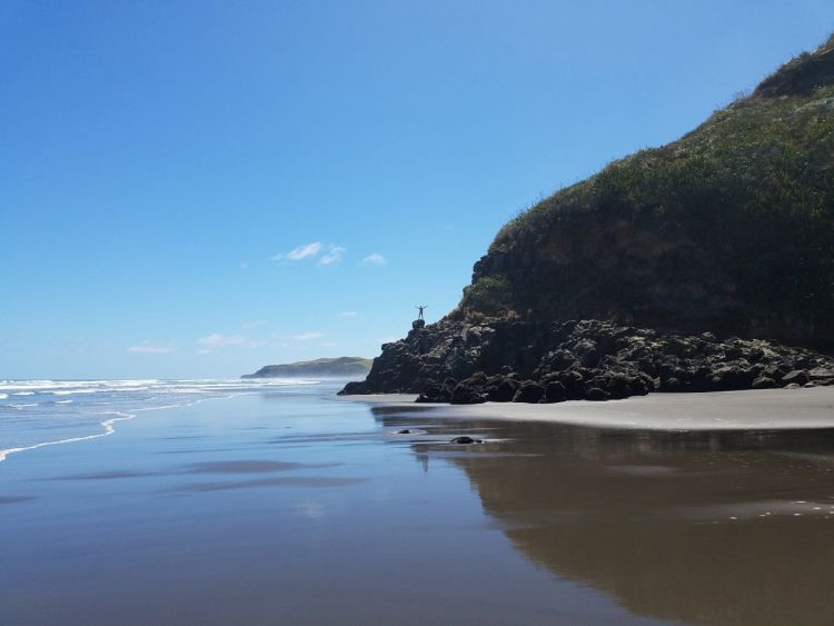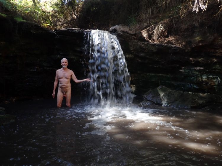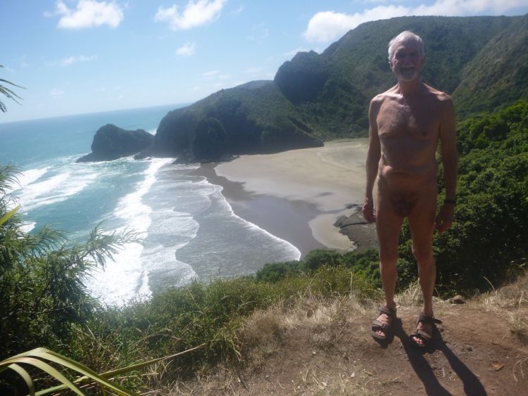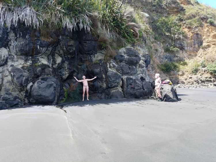 Am nächsten Tag erkundeten wir mehrere der wunderschönen Strände mit schwarzem Sand westlich von Auckland, die alle entweder von Dünen oder Klippen umgeben sind. North Piha Beach, selbst z. T. nackt genutzt, ist der Beginn einer schönen, aber herausfordernden Strecke, die auf und über eine Landzunge nach White's Beach führt - ein großer Spaß, sie nackt zu bewältigen. Der steile Abstieg wird durch am Stein befestigte Drahtseile unterstützt. Die schwierige Route hält das textilierte Publikum weitgehend fern. So waren nur sehr wenige Leute da, darunter mindestens ein weiterer FKK-Anhänger, so dass wir etwa eine Stunde in der Nachmittagssonne genossen haben. Wir beendeten den Tag mit einem Besuch eines weiteren hohen Wasserfalls, der allerdings zu beliebt ist, um sich dort nackt aufhalten zu können.