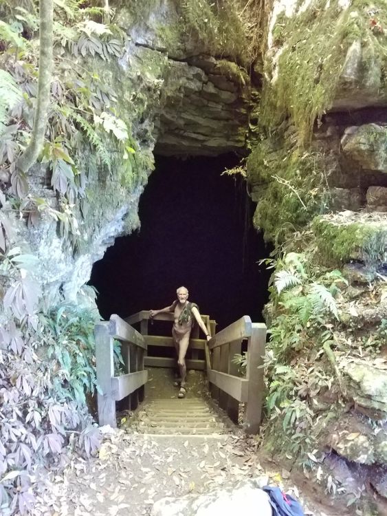 Am zweiten Tag, als wir zu unserem nächsten Quartier in Waitomo reisten, hielten wir zuerst in Taharoa an, einem weiteren breiten, leeren schwarzen Sandstrand, der perfekt für nackte Erforschungen der Gegend geeignet ist. Für den anschließenden Besuch der Marokopa Falls mussten wir uns anziehen, aber wir waren allein in der Piripiri-Höhle weiter die Straße hinauf und konnten sie nackt erkunden, soweit es das vorhandene, von draußen herein scheinende Licht erlaubte. An der letzten Station vor Waitomo, die Mangapohue Natural Bridge, befanden sich zu viele Bekleidete, aber wir kamen mit einem von ihnen ins Gespräch und konnten ihm (zumindest verbal) das Konzept des Nacktwanderns vorstellen.