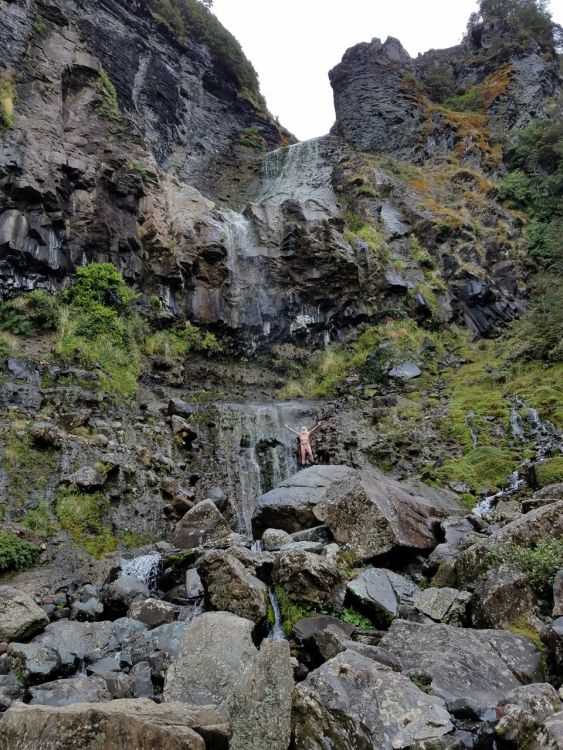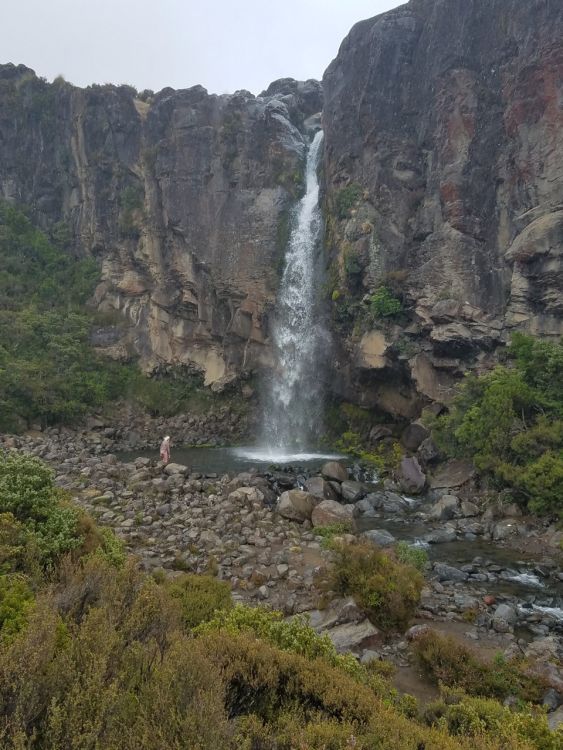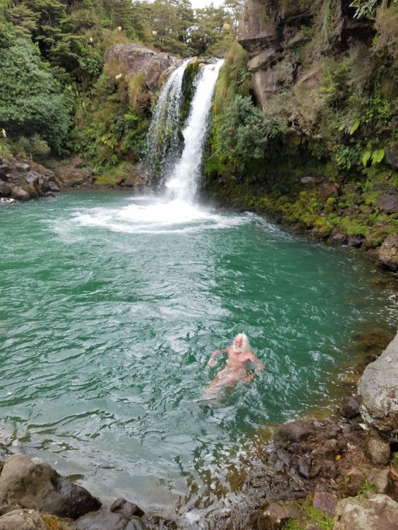 Der fünfte Tag brach kalt, windig und regnerisch an, so dass unser Plan, die Südhänge des Mount Ruapehu hinaufzusteigen, gestrichen werden musste, aber nicht bevor Dan (und vielleicht John?) eine kurze, aber kühle Nacktwanderung in den heulenden Winden machten. Weiter bergab waren wir genügend vor dem Wind geschützt, um die Mangawhero Falls (mit Kleidung, da die Straße sich direkt nebenan befindet) und die 128 Fuß hohen Waitonga Falls zu besuchen (wo Dan und John trotz des kalten Wassers ein nacktes Bad nahmen). Dan ging einen Großteil der 45 Minuten zurück zum Auto nackt.