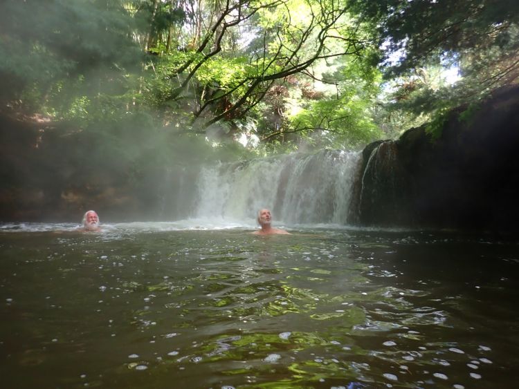 Am späten Nachmittag machten wir uns auf den Weg zu einem "versteckten" warmen Wasserfall und erhielten wieder die Zustimmung der wenigen Leute, die bereits dort waren, dass wir ihn nackt benutzen könnten. Als nächstes auf der Liste der "Heißwasser-Krabbler" des siebten Tages stand der einzigartige Hot 'n' Cold Pool (alias: Die Brücke), wo ein heißer Bach in einen etwas größeren, kalten fließt, und man die Temperatur wählen kann, indem man das Wasser vermischt. Es waren bereits mehr als ein Dutzend Touristen im Wasser, aber Dan fragte und erhielt erneut die Zustimmung, so dass wir die Kleidung ausziehen konnten. Den Tag beendeten wir mit einem Besuch in einem gemeinschaftlich geführten Hot Pool, wo die vier Einheimischen, die sich bereits im Pool befanden, uns ebenfalls erlaubten, nackt mit ihnen zu baden ("solange hier keine Kinder sind").