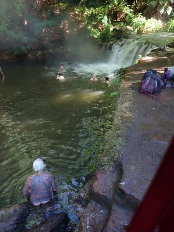 Am sechsten Tag erreichten wir Rotorua, berühmt wie Yellowstone für seine kochenden Seen und sprudelnden Schlammtöpfe. Am siebten Tag war es jedoch anders, als wir die geothermisch beheizten Bäche, Wasserfälle und Pools südlich der Stadt erkundeten. Als wir an dem ersten Ziel, dem Kerosene Creek, einen riesigen Reisebus auf dem Parkplatz sahen, dachten wir, dass wir hier wohl nicht nackt sein könnten. Aber Dan bat frei heraus um das Einverständnis der Insassen des Haupt-Pools, und gleich zogen wir uns alle aus. Nicht weit entfernt fanden wir den Weg zum Rainbow Mountain und machten eine tolle Nacktwanderung (7 km hin und zurück) - nur auf dem Gipfel, auf dem bekleidete Touristen verweilten, zogen wir uns an.