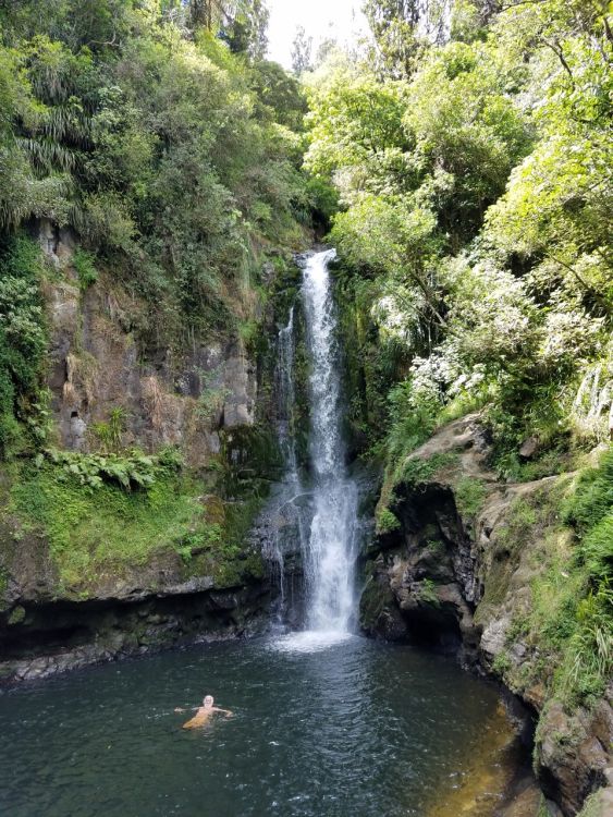 Gesund genug, um die Aktivitäten wieder aufzunehmen, kam ich am nächsten Tag dazu, als wir nackt wanderten, um eine weitere Stelle mit riesigen Kauri-Bäumen zu besuchen. Unser nächster Stopp danach waren die Kaiate Falls in den Hügeln über der Küstenstadt Tauranga. Auf dem Parkplatz waren andere Autos, also starteten wir die Wanderung bekleidet, zogen aber später die Klamotten aus, als wir den untersten Wasserfall und Natur-Pool zum Mittagessen erreichten. Die Schlucht und die Wasserfälle waren attraktiv, aber da es höher gelegene, große Viehweiden gab, war die Wasserqualität enttäuschend - eine Tatsache, die Dan nicht von einem kurzen nackten Bad abhielt.