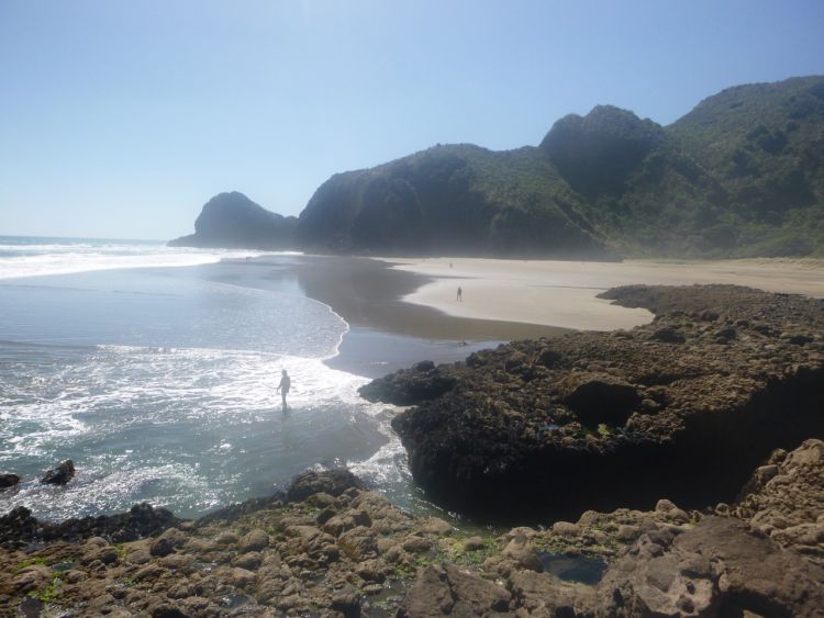 Unser erster Halt war die Strand- und Surfergemeinde Raglan. Am ersten Tag, nachdem wir die nahe gelegenen Bridal Veil Falls besucht hatten, gingen wir zum südlichen Ende des langen und wunderschönen Ruapuke Beach, einem schwarzen Sandstrand, der von Dünen und Klippen umgeben ist. Einige professionelle Hunde-Ausführer kamen vor uns dort an, aber der Strand war bei Ebbe so groß, dass wir nackt gehen konnten, ohne womöglich jemanden zu verärgern. Wir umrundeten eine Landzunge und genossen die Sonne, die Brandung und die Felsen über Mittag. Der einzige Wermutstropfen war, dass der kleine Wasserfall, der direkt auf den Strand fiel, in den Dan sich natürlich sofort stürzte, unangenehm roch - vielleicht wegen Kuhweiden oben auf den Klippen.