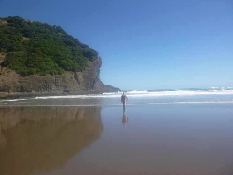 Weiter um den Berg herum erreichten wir Ngarunui Beach, auf dem schon mal bekleidete und naturistische Menschen gemeinsam anzutreffen sein sollen. Ein langer, breiter und sandiger Strand am späten Nachmittag, ganz passend für uns Nackte und die zahlreichen bekleideten Hundeausführer. Schließlich kehrten wir wieder nach Raglan zurück.