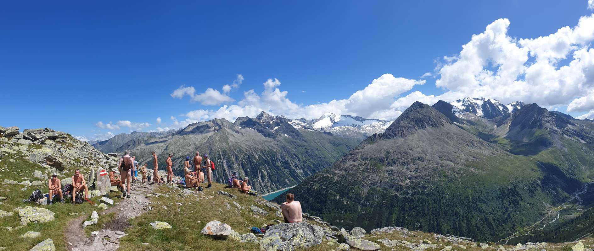 Auch 2020 traf sich wieder eine internationale Gruppe von Naturist(inn)en aus Irland, England, den Niederlanden, Belgien, Frankreich, der Schweiz, Österreich, der Slowakei und Deutschland in einem Seitental des Zillertals, um in alpiner Umgebung nackt zu wandern. Anfangs war es kühl und nass, später dann sommerlich, z. T. heiß und sonnig, und alle hatten wir eine Woche lang gemeinsam unseren Spaß und unsere Freude an der beeindruckenden Natur.