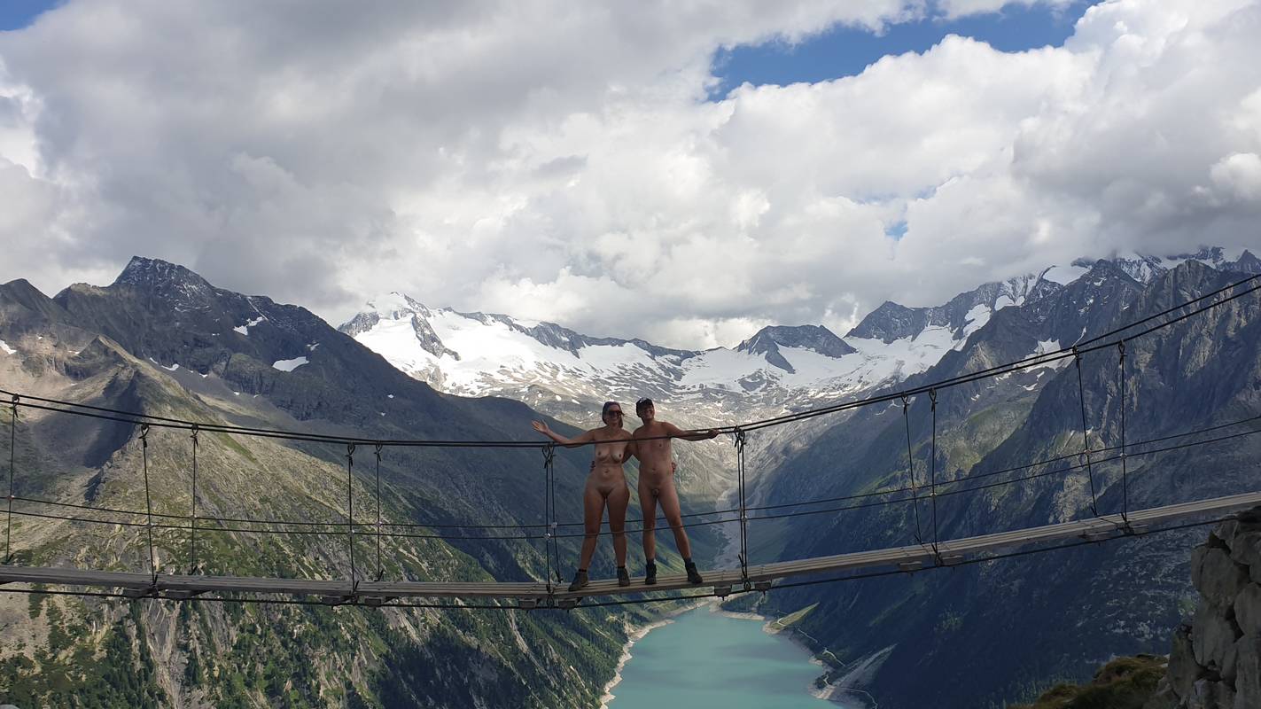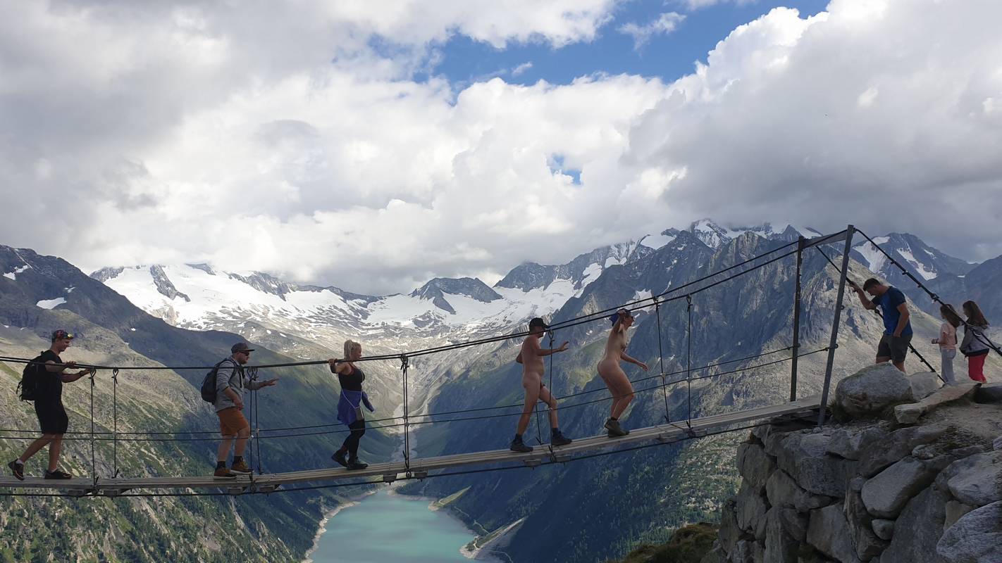 Einmal traf die nackte Wandergruppe auf eine Hängebrücke. Wir warteten geduldig in einer Schlange von bekleideten Wanderern nahe einer Hütte oberhalb des bekannten Schlegeis-Stausees. Alles stand unter dem Motto »Bloß zusammen leben«. - Rainer