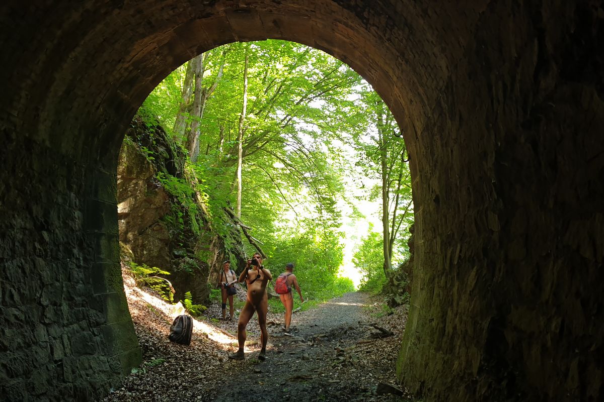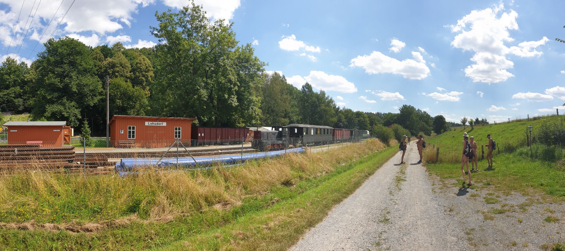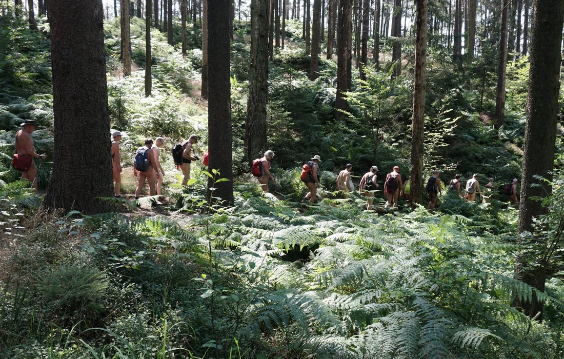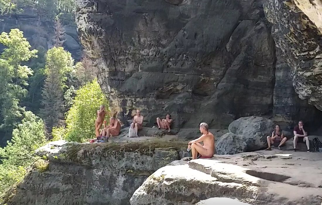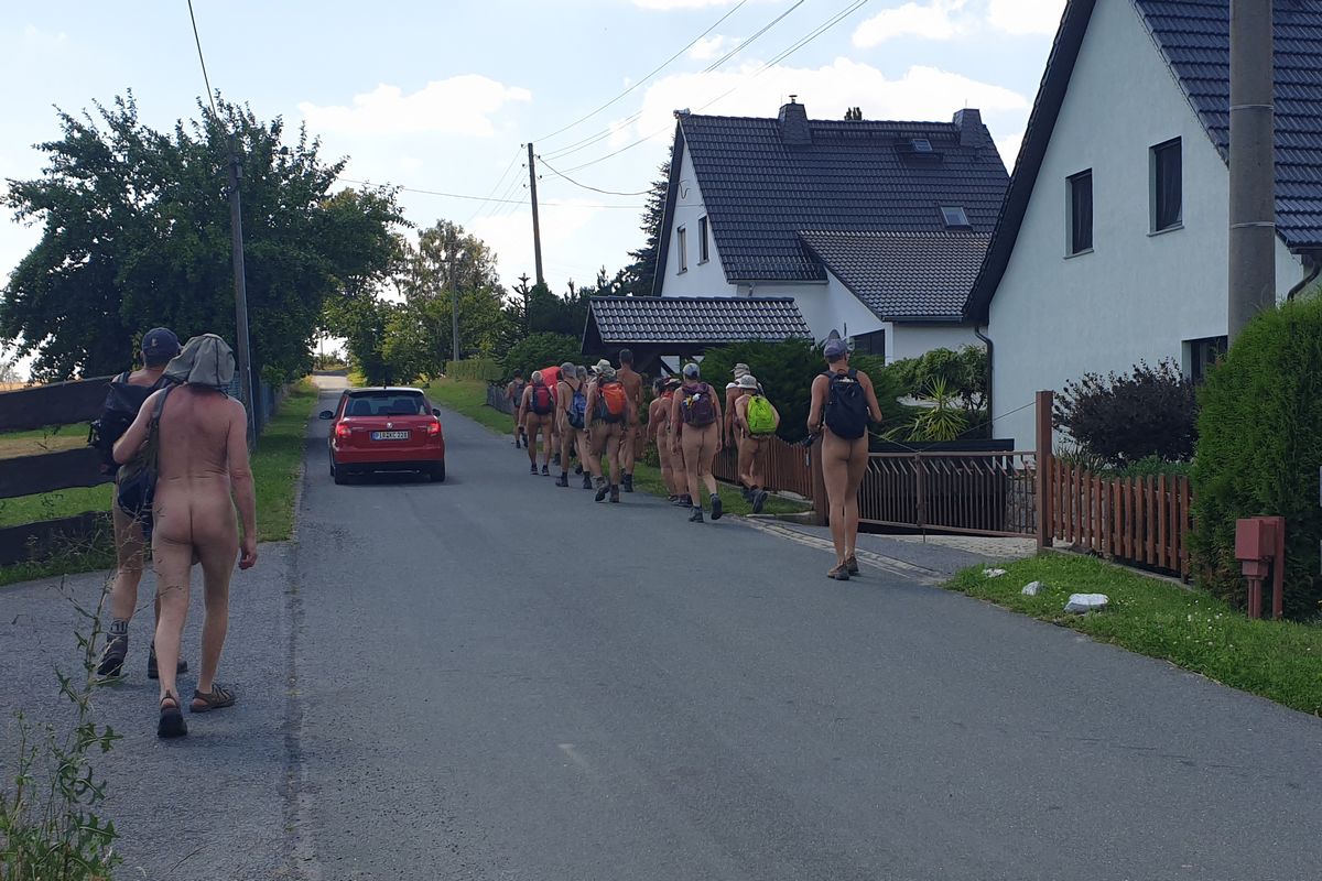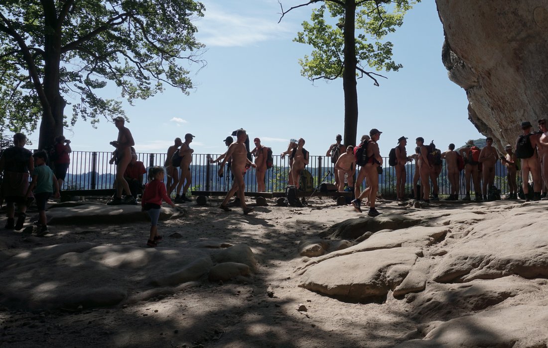 Zur Samstagswanderung versammelten sich 38 Naturist*innen in Ottendorf am FeWo-Domizil, von wo aus zunächst der erste Kilometer bis zum Ortsrand bekleidet zurück gelegt wurde. Danach wurde der nahe gelegene Arnstein erklommen. Der teils steile Aufstieg enthielt ein paar Passagen, an denen man sich klein und schlank machen oder auch die Arme zu Hilfe nehmen musste, um ans Ziel zu gelangen.