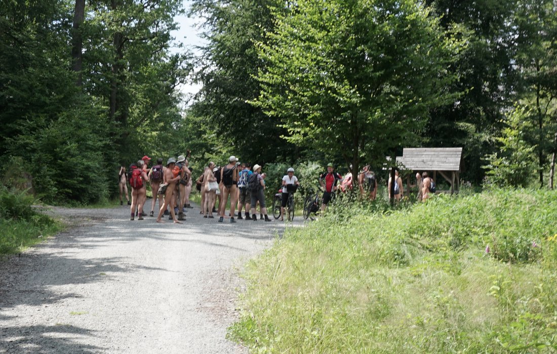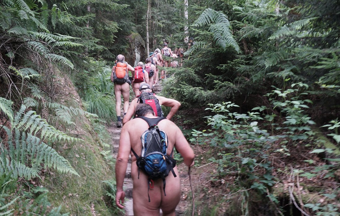 Auf den großenteils schmalen Pfaden traf die nackte Wandergruppe von 36 Personen immer wieder auf entgegen kommende Gruppen und Familien, so dass es regelmäßig zu kleinen Staus kam, um die entgegen kommenden passieren zu lassen. Meist kam es dabei auch zu Gesprächen, und zwei junge Damen mit Hund interessierten sich sogar für die Möglichkeit, an einer der Wanderungen der nächsten Tage mitzumachen.