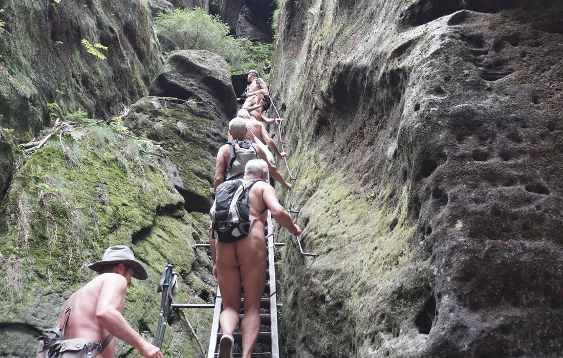 Anschließend gelangten die 31 naturistischen Wanderer und -innen über die 35 cm breite Himmelsleiter, die in eine schmale Steinspalte gebaut ist, ins obere Geschoss des Kuhstalls (»Neuer Wildenstein«). Auch hier waren bekleidete Gruppen und zahlreiche Familien in der Überzahl, und viele davon stellten uns interessiert Fragen, so dass sich mehrere Gesprächsrunden über unsere Art zu wandern entwickelten. Die Website »nackt minus wandern punkt de« haben sich viele gemerkt, um mehr darüber zu lesen.