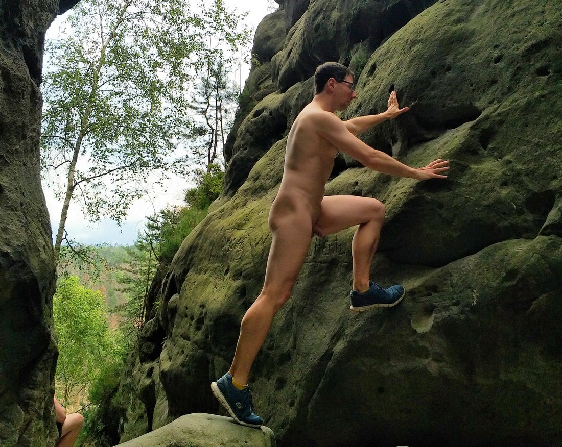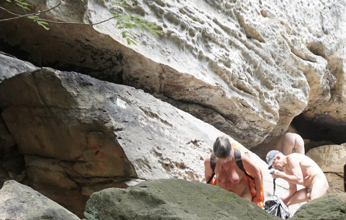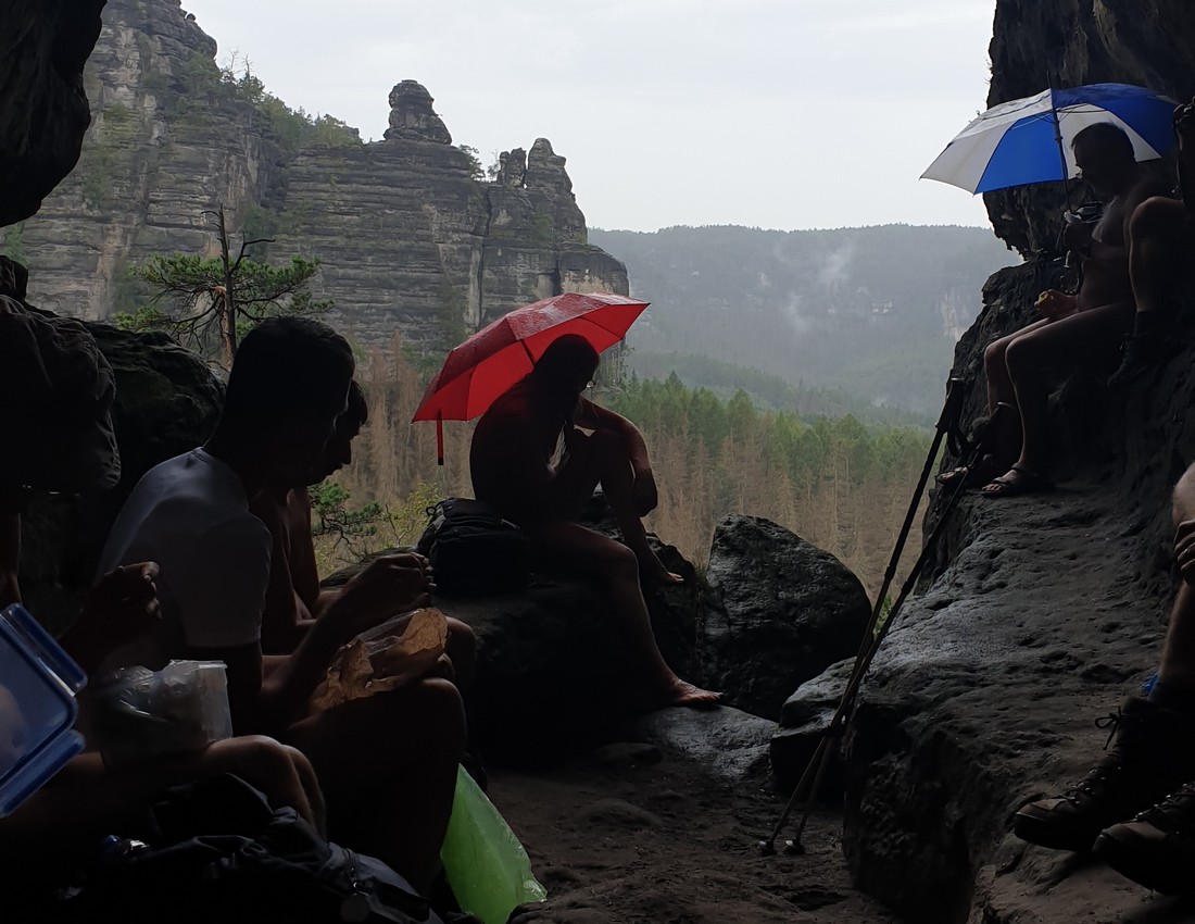 Regen begleitete den Aufstieg zum »Winterstein«, der auch »Hinteres Raubschloss« genannt wird. Dort fanden wir in einer Höhle einen trockenen Rastplatz mit Aussicht. In der Höhle kamen wir mit einigen jungen Leuten ins Gespräch, die dort nach dem Aufstieg mit Kleidung und Regenschutz versuchten, wieder trocken zu werden. »Ja, ihr macht das richtig. Wir würden ja am liebsten auch nackt wandern, aber wir haben keinen Platz, um die Kleidung zu verstauen.« Textilträger halt: Wenn es ums Nacktwandern geht, sind sie um keine Ausrede verlegen.