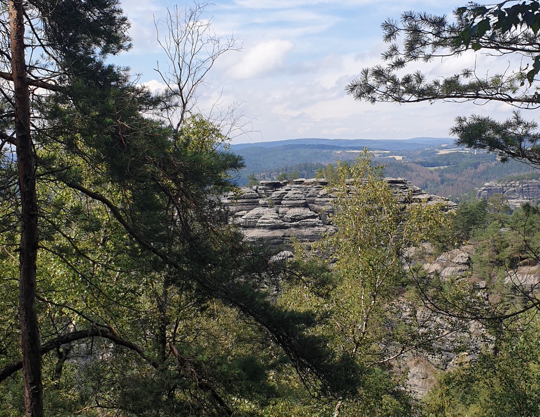 Der Regen entwickelte sich nach und nach zurück und machte ersten Sonnenstrahlen Platz. Im Laufe des Nachmittags gewann die Sonne dann die Oberhand. Wir passierten noch die »Marienhöhle« und stiegen dann zum »Bärfangkegel« auf. Entlang des Bergkamms boten sich weitere Aussichten auf benachbarte Steinformationen.