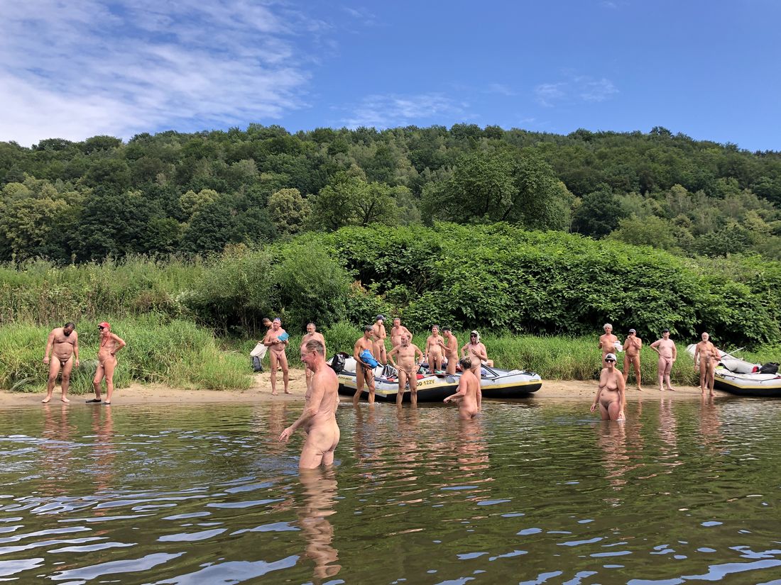 Bereits 2018 und 2019 wurde die Möglichkeit, das Elbtal vom Wasser aus nackt paddelnd zu erkunden, gerne angenommen. Diesmal waren 25 Naturist(inn)en interessiert und reisten von der Hütte per Linienbus nach Bad Schandau. 24 davon verteilten sich auf drei Schlauchboote, einer bevorzugte ein Einer-Kayak.