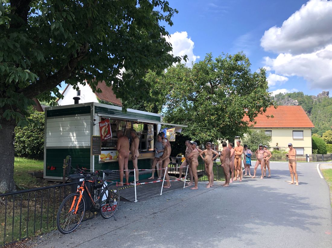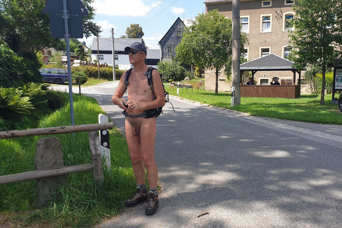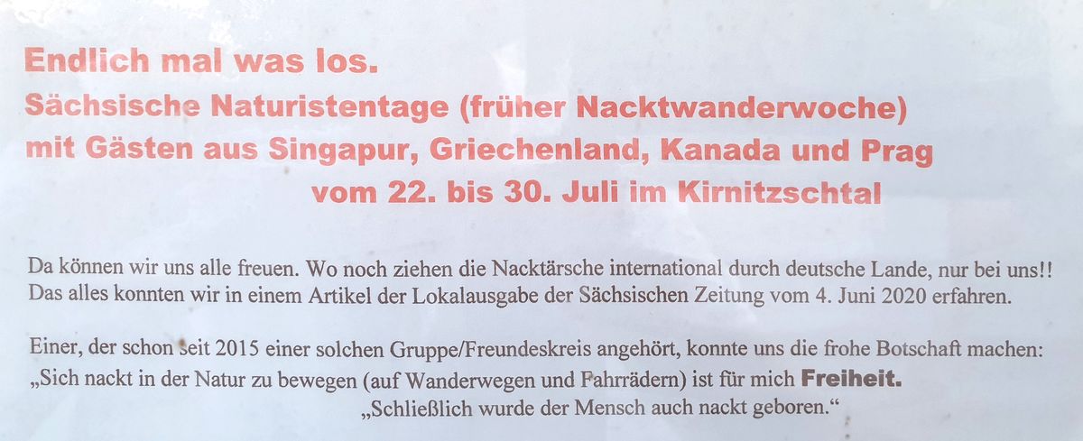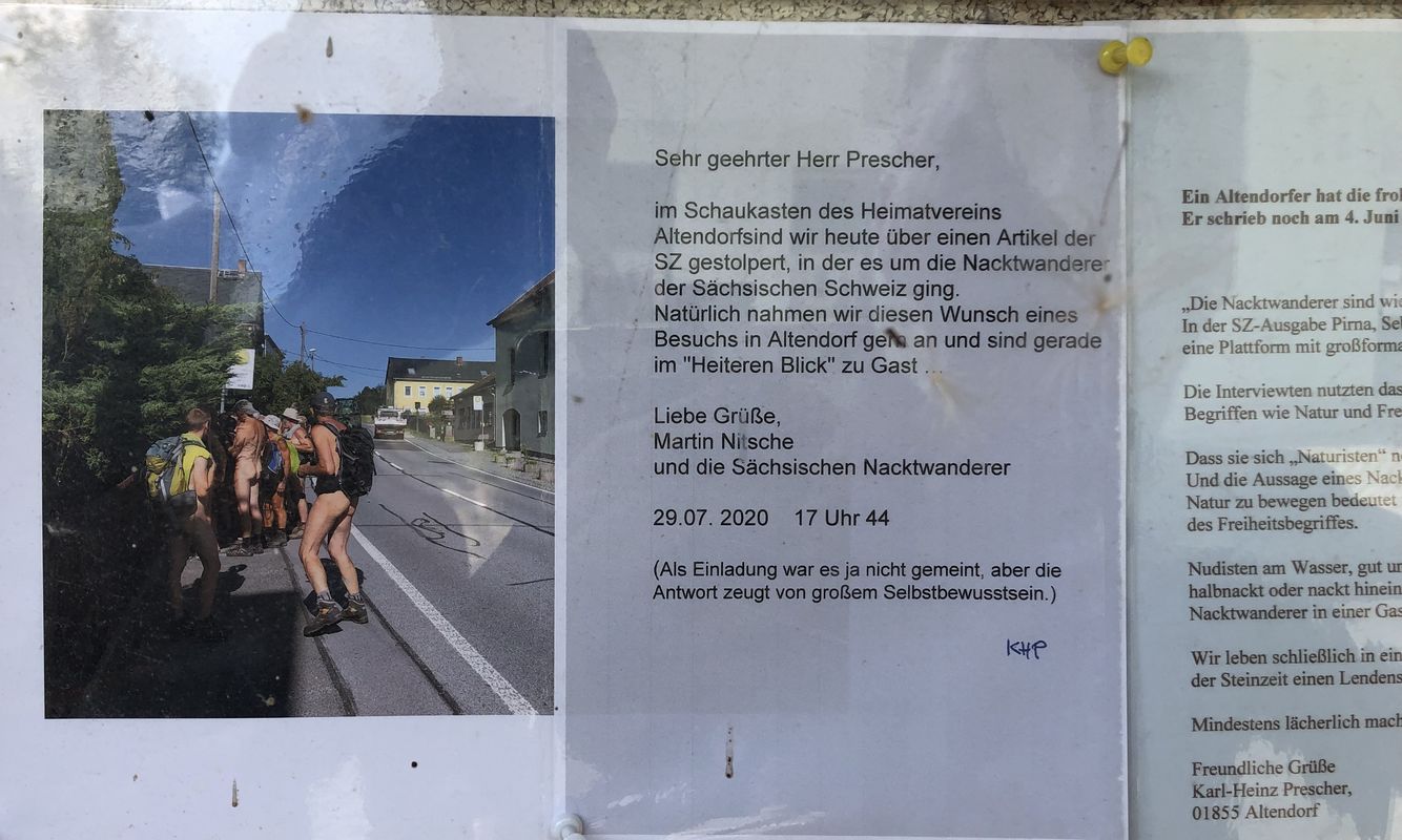 Dabei entdeckten wir, dass der Heimatverein des Dorfes unter dem Motto »Endlich mal was los« unsere Nacktwanderungen rund ums Kirnitzschtal auf seiner Info-Tafel angekündigt hatte. Bezug genommen wurde dabei auf einen Artikel der