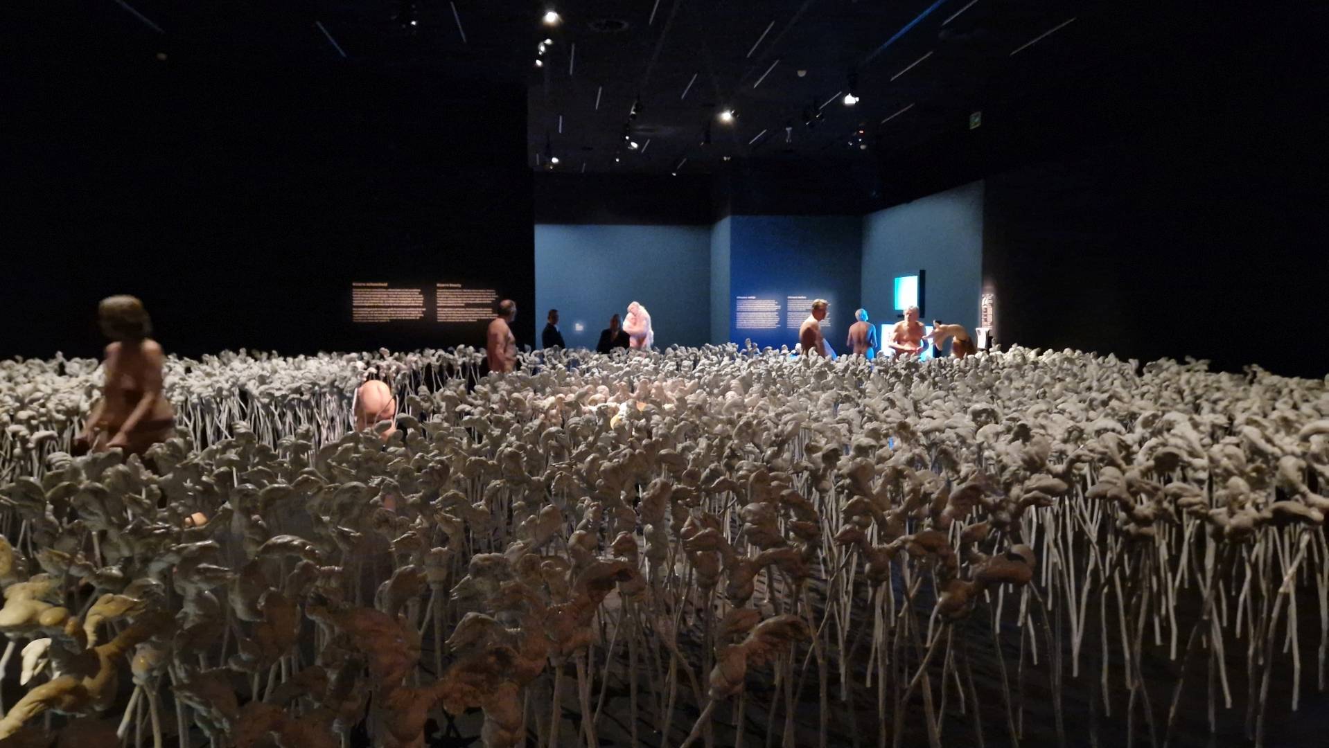 Eine Installation in einem höhlenartigen Raum vereint einige Egg Men mit hängenden Skulpturen. Beide sind fantastische Mischformen: