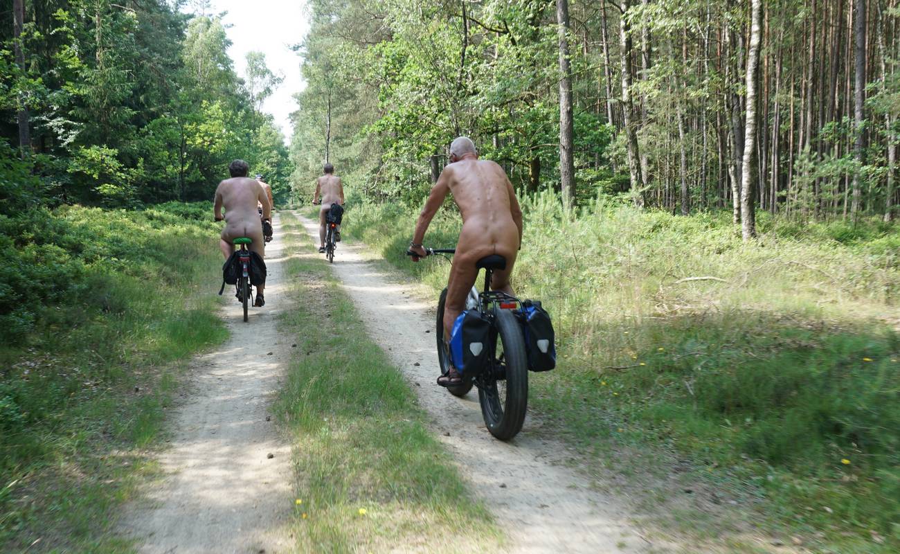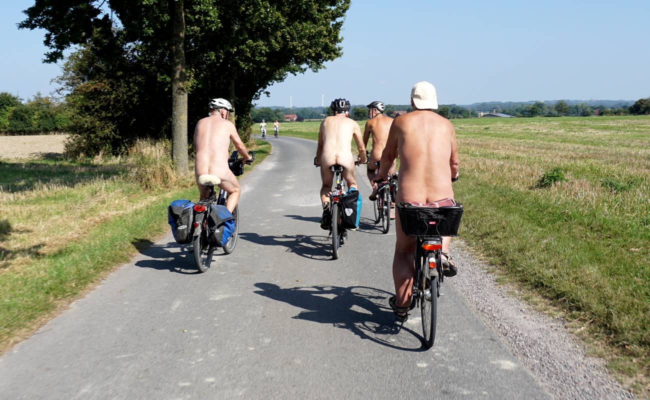 1/3: Eine kleine Nacktradelgruppe im Münsterland