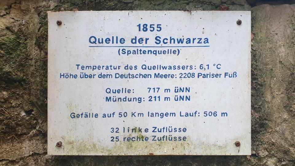 Nach ca. der halben Strecke erreichten wir die Trinkwasser-Talsperre Scheibe-Alsbach mit einem angenehmen Rastplatz. Im Aufstieg von dort erreichten wir die Quelle der Schwarza: »An der Nordabdachung des Sandwieschensattels in 717 m Höhe über NN entspringt – etwa 250 m nordwestlich des Rennsteigs – die Schwarza. Mit einer zu jeder Jahreszeit konstanten Temperatur von 6,1°C steigt das Wasser an einer Bruchspalte (Spaltenquelle) zwischen Schiefer und Buntsandstein empor.« [Aus einer Informationstafel an der Quelle – 2022]