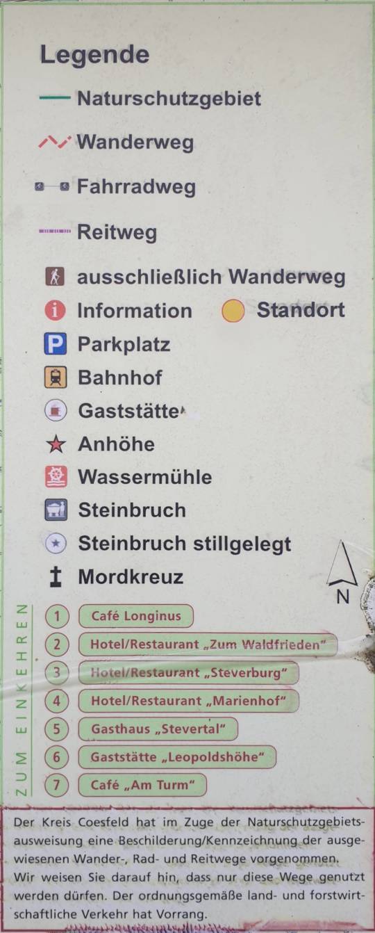 Wir beendeten unsere Wanderung, grüßten Passanten und stiegen in unsere Fahrzeuge. Luit fuhr hinter mir her, um seine wartende Freundin abzuholen. Zusammen fuhren wir über Landstraßen durch Bauerschaften in den Landkreisen Recklinghausen und Coesfeld Richtung Lavesum und von dort zwischen ehemaligem Militär-Übungsgelände und A43 zum Restaurant „Haus Waldfrieden“ bei Merfeld / Dülmen. Luits Freundin spricht außer Niederländisch besser Englisch als Deutsch und fragte mich, woher ich so flüssig Englisch spreche. Ich erklärte ihr mein häufiges Mitwirken an https://natury.info und die damit verbundene Involvierung von Muttersprachlern: