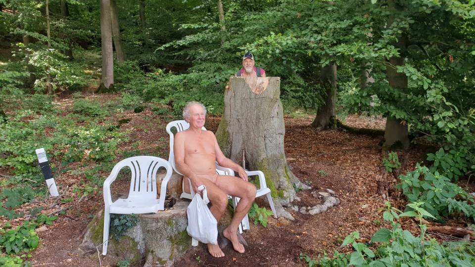 Die Lufttemperatur betrug wiederum 24°C am Vormittag und stieg im Tagesverlauf auf 28°C an. Die wandernden Nackten freuten sich über mäßiges Gehtempo und viel schattigen Wald. Die Ehefrau eines der Wanderer begleitete uns bekleidet, sie fühlte sich in unserer Gemeinschaft wohl. Da sie sonst so lange Strecken lieber radelt als wandert, war sie nach den 18 km mit 150 Höhenmetern - so wie einige andere auch - entsprechend „geschafft“.
