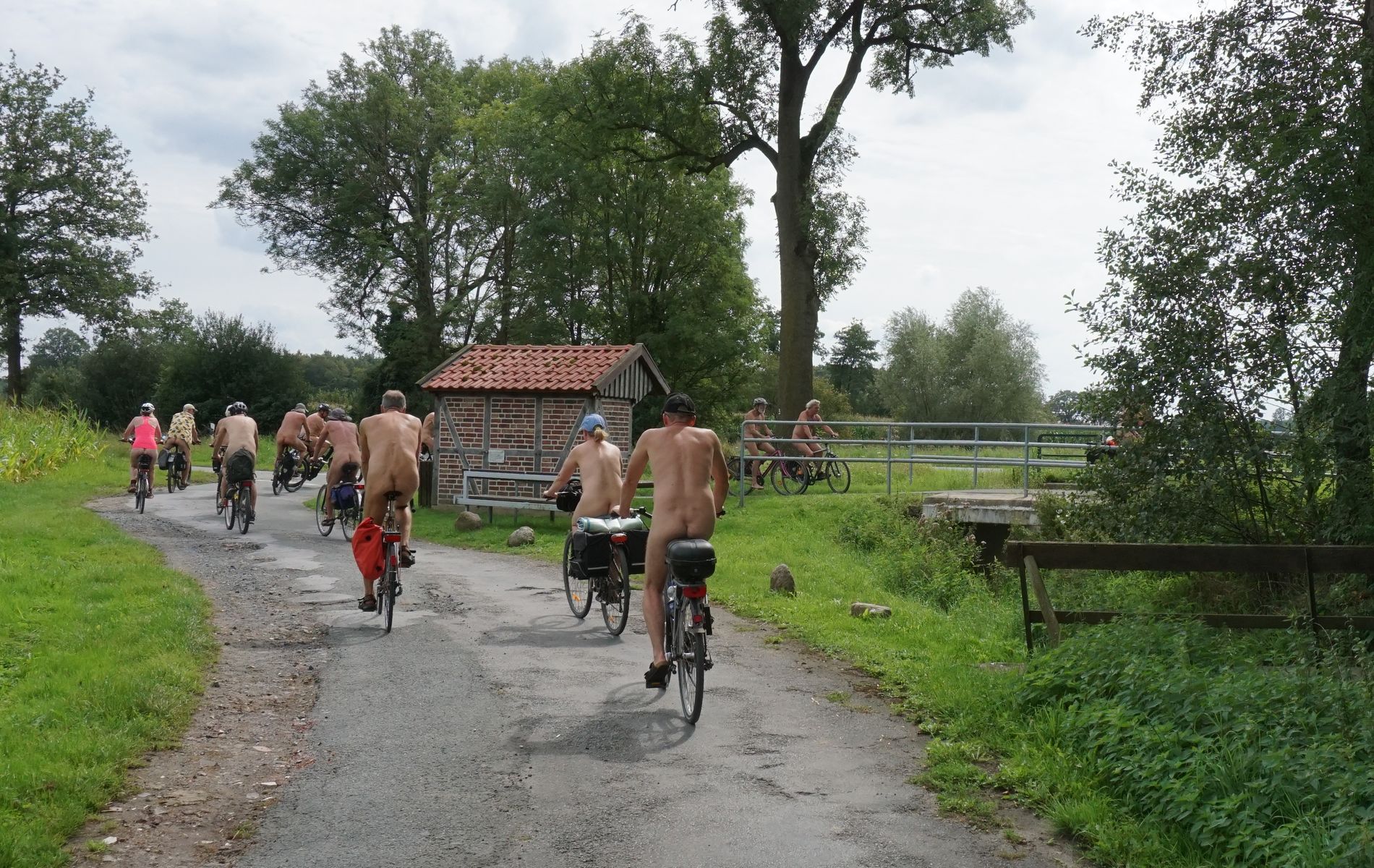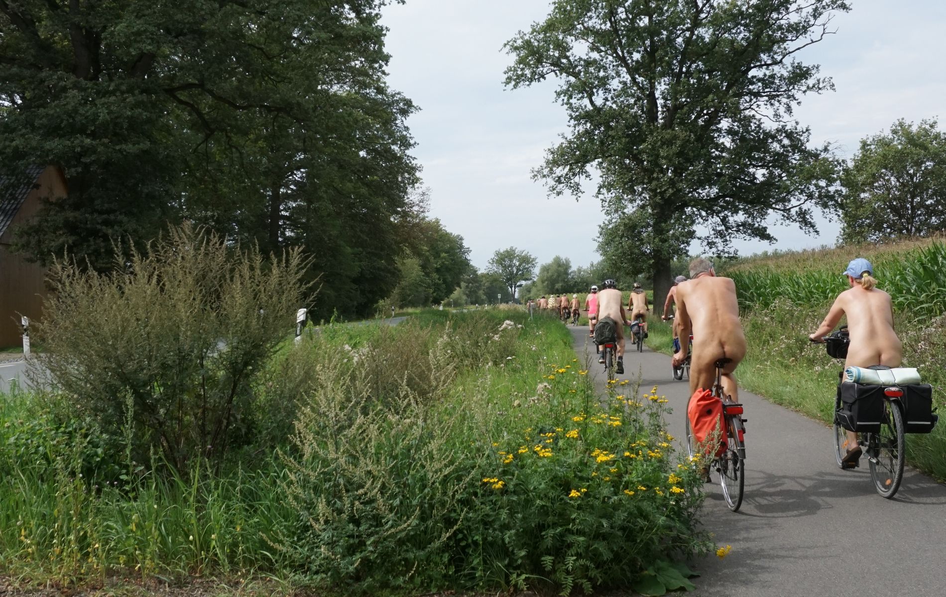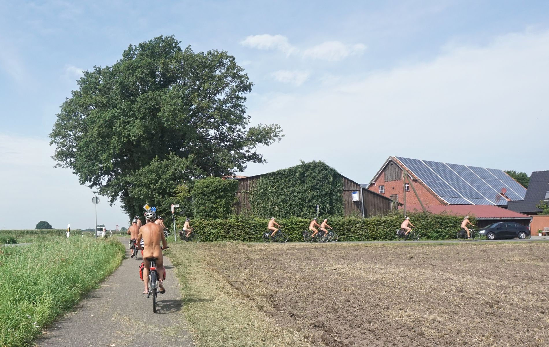 Zwischen Nordwalde und Emsdetten führte die Radelroute über rund 50 km, auf die sich achtzehn Naturisten freuten. Nur zeitweise durch Wolken gefilterter Sonnenschein und Temperaturen zwischen 23 und 26 Grad förderten das Wohlbefinden durch beständigen Fahrtwind, aber auch die Notwendigkeit einer Beschichtung mit Sonnenschutz.