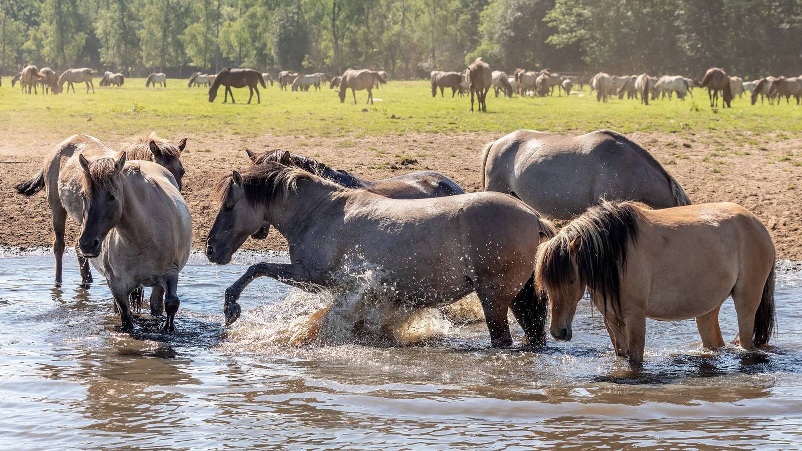 Dabei geht es gar nicht primär darum, das Leben der Pferde zu schützen - auch in freier Natur würde es ja vorkommen, dass etwa ein Fohlen einem Wolfsriss zum Opfer fiele. Wesentlich schwerer wog bei der Entscheidung im Kreistag die Bedrohung durch ausbrechende Wildpferde, wenn ein Teil oder gar die gesamte Herde aufgrund von reißenden Wölfen in Panik geraten und die bisherigen, leichteren Zäune durchbrechen könnten. Dann entstehe eine unmittelbare Gefahr für Menschen, weil eine größere Anzahl von Pferden im Panikgalopp durch bewohnte Gebiete, über Straßen und die nahe Autobahn rasen und Massenunfälle verursachen könnte. Quelle: WDR Lokalzeit Münsterland